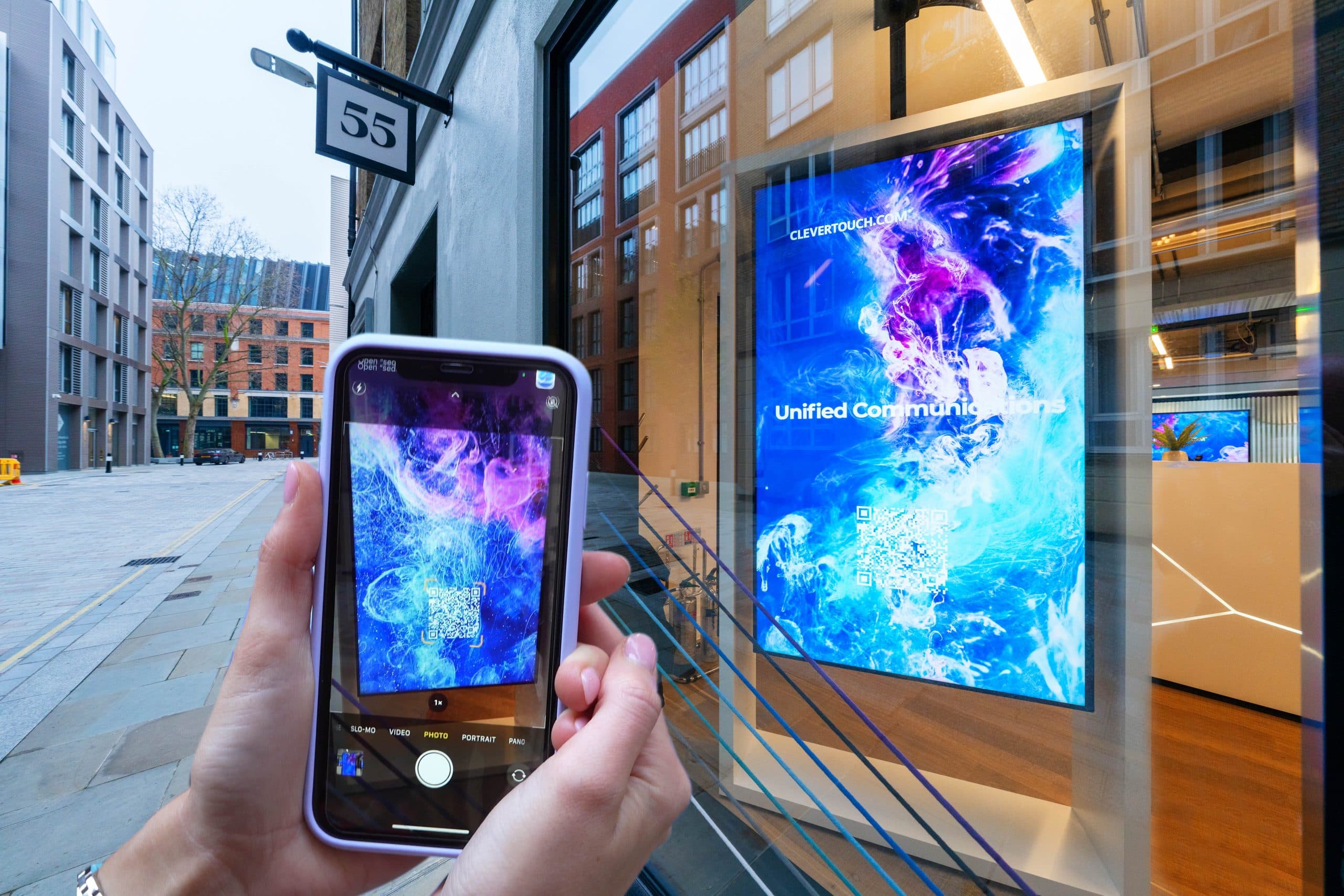 Besucher können von ihrem Telefon aus auch mit der Beschilderung an der Fassade interagieren und spontan ein Meeting mit dem Clevertouch-Team buchen.