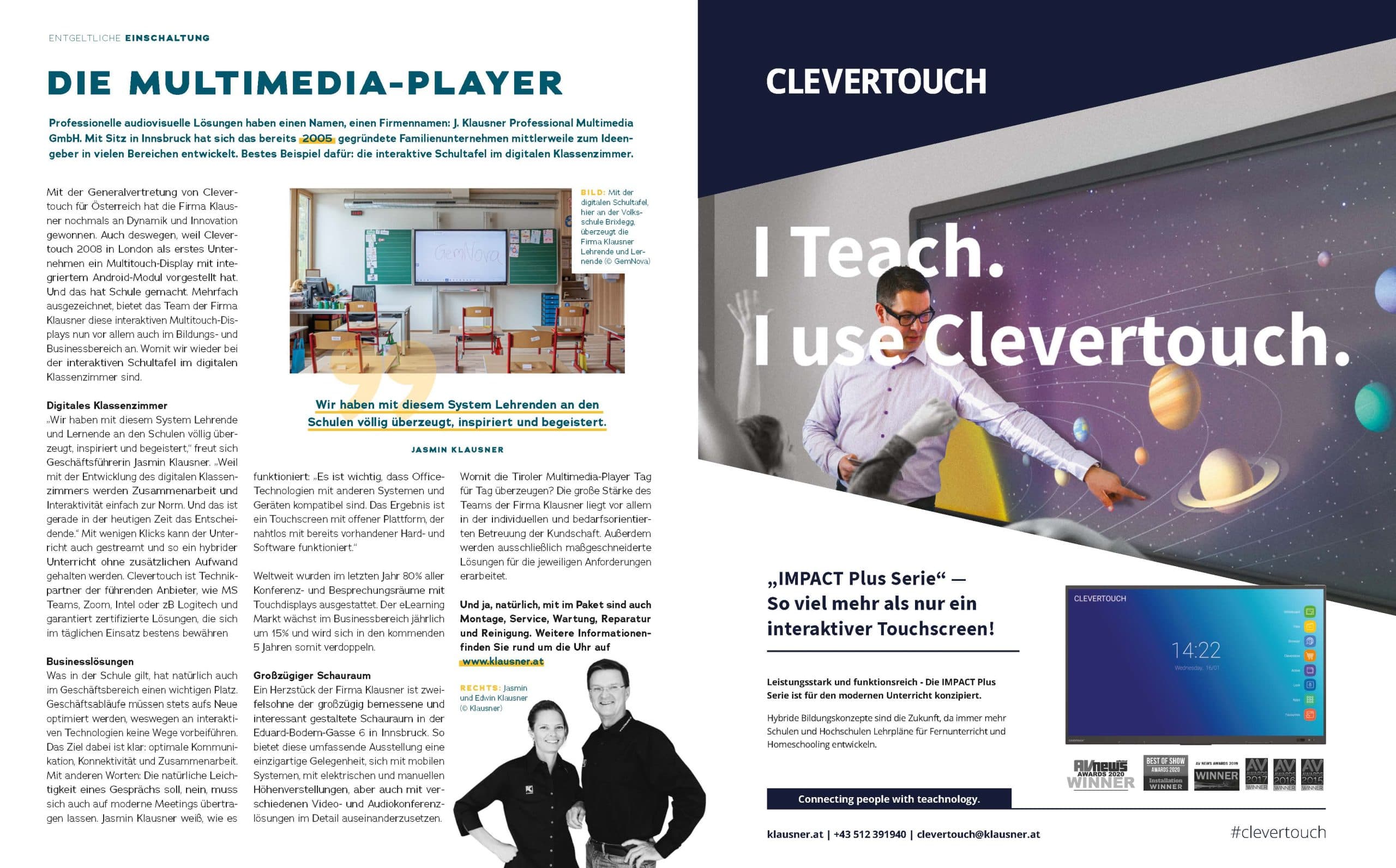 Professionelle audiovisuelle Lösungen haben einen Namen, einen Firmennamen: J. Klausner Professional Multimedia GmbH. Mit Sitz in Innsbruck hat sich das bereits 2005 gegründete Familienunternehmen mittlerweile zum Ideengeber in vielen Bereichen entwickelt. Bestes Beispiel dafür: die interaktive Schultafel im digitalen Klassenzimmer.