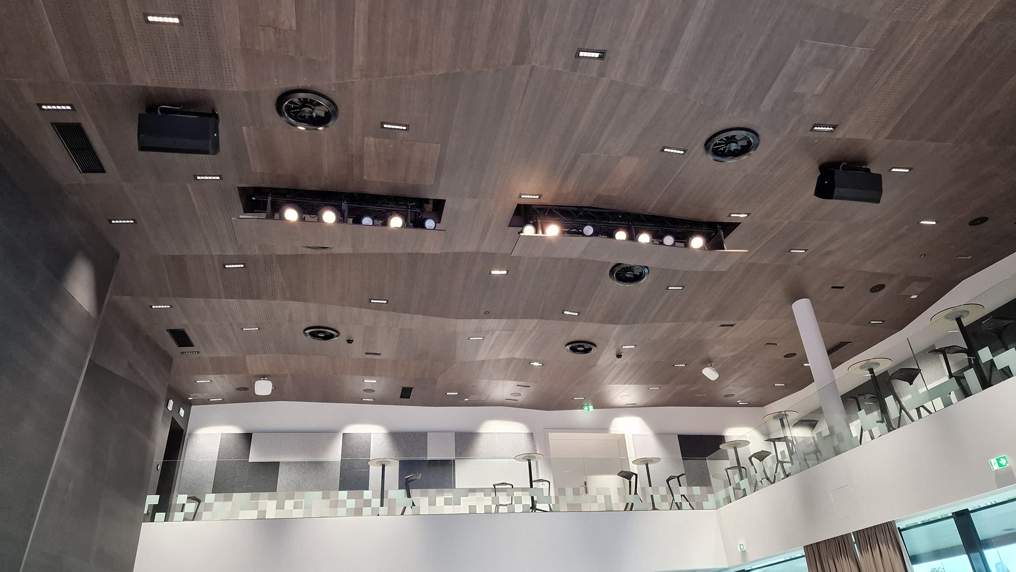 Das Bühnenlicht ist in der akustisch designten Deckenkonstruktion versenkt. Per Tipp auf dem Touchpanel fahren die Portallifte nach unten und verschiedene Lichtstimmungen können aufgerufen werden. Das Touchpanel ist versenkt in einer Wandeinbaudockingstation eingbaut und kann bei Bedarf mittels Codeeingabe auch daraus entnommen werden.
