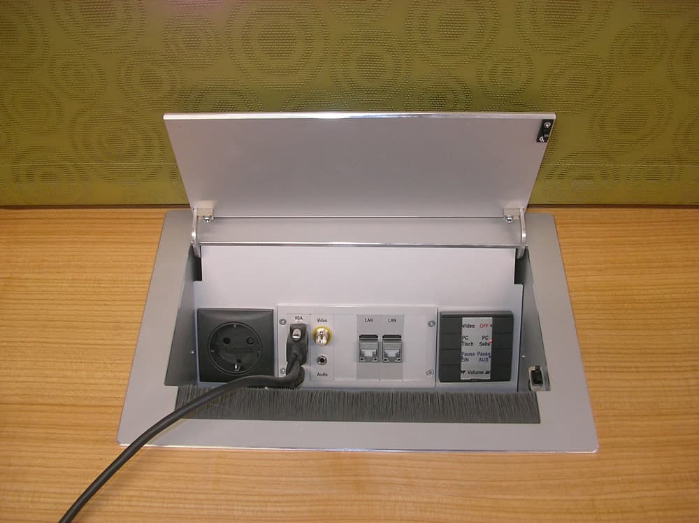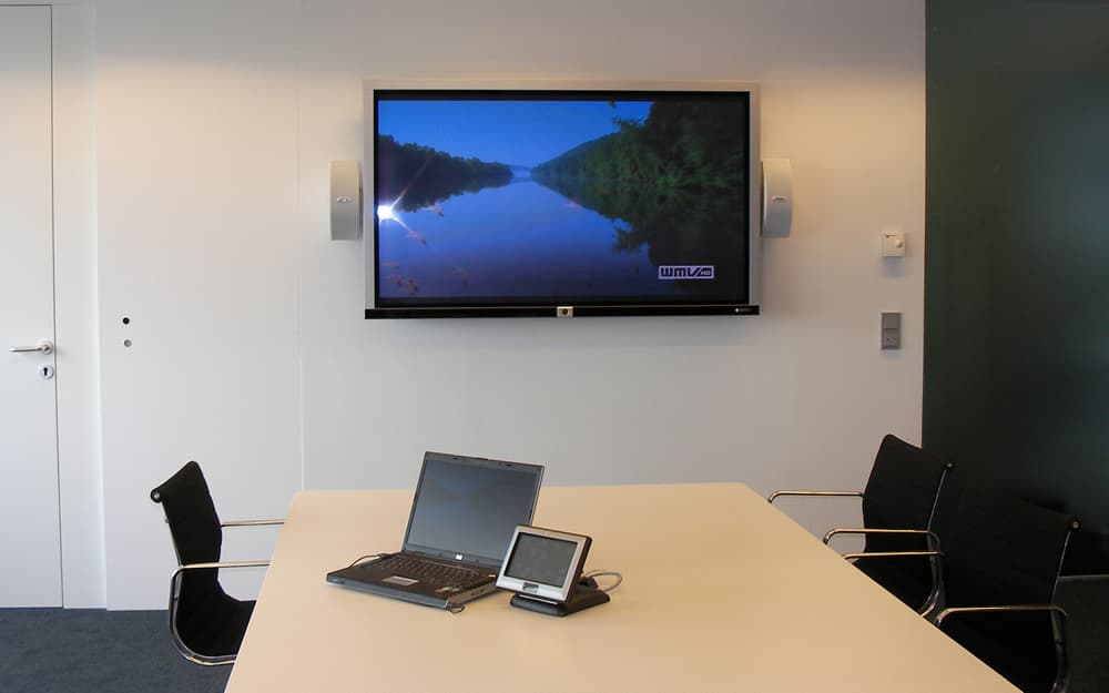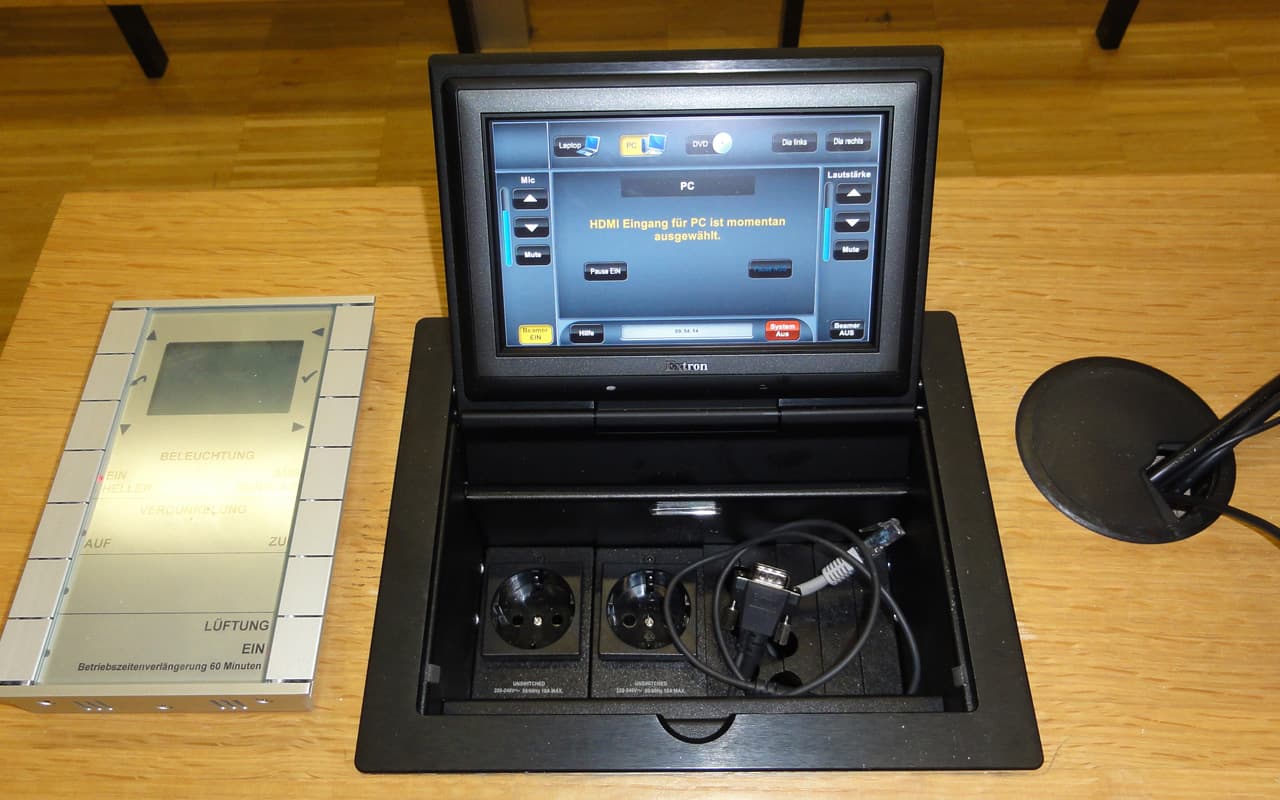 Ausstattung Minister Besprechungsraum mit 98″ Display, Extron HDMI Tischanschlüsse, Bedienung über AMX Touchpanel