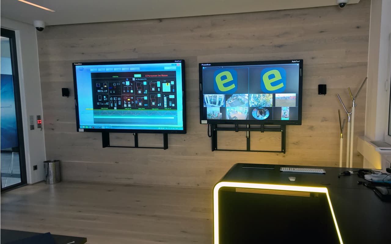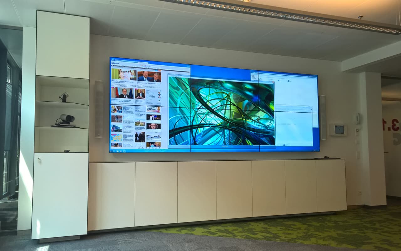 3×2 Videowall mit 6K Auflösung, Full-HD Contentzuspielungen, Extron 4K Crosspoint 108 mit 10 Ein- u. 8 Ausgängen, Einbindung VCS, 2 SAT-Receiver, Computer, Bedienung über Touchpanel